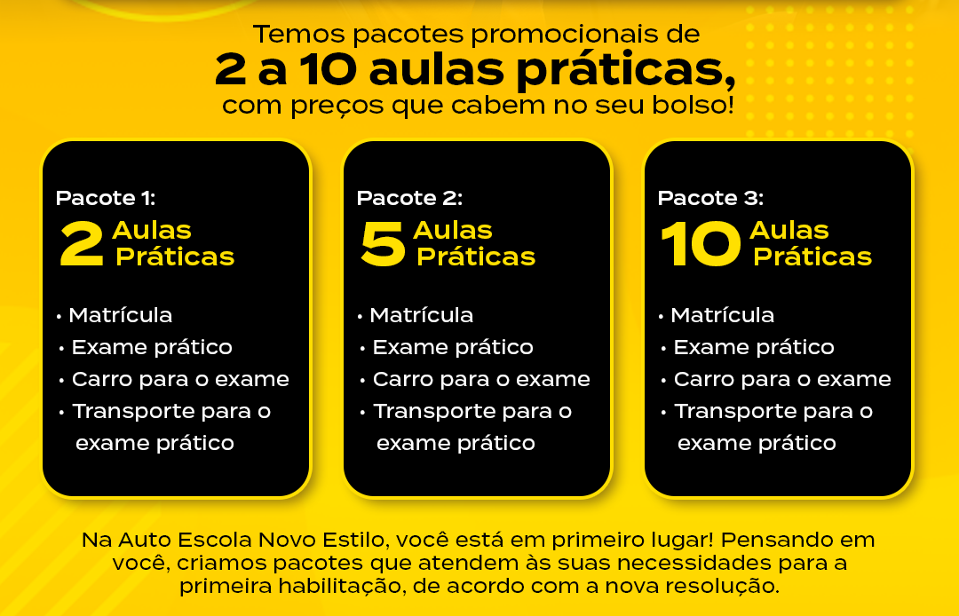 Temos pacotes promocionais de2 a 10 aulas práticas,com preços que cabem no seu bolso! Pacote 1: 2 AulasPráticas • Matrícula• Exame prático• Carro para o exame• Transporte para o exame prático Pacote 2: 5 AulasPráticas • Matrícula• Exame prático• Carro para o exame• Transporte para